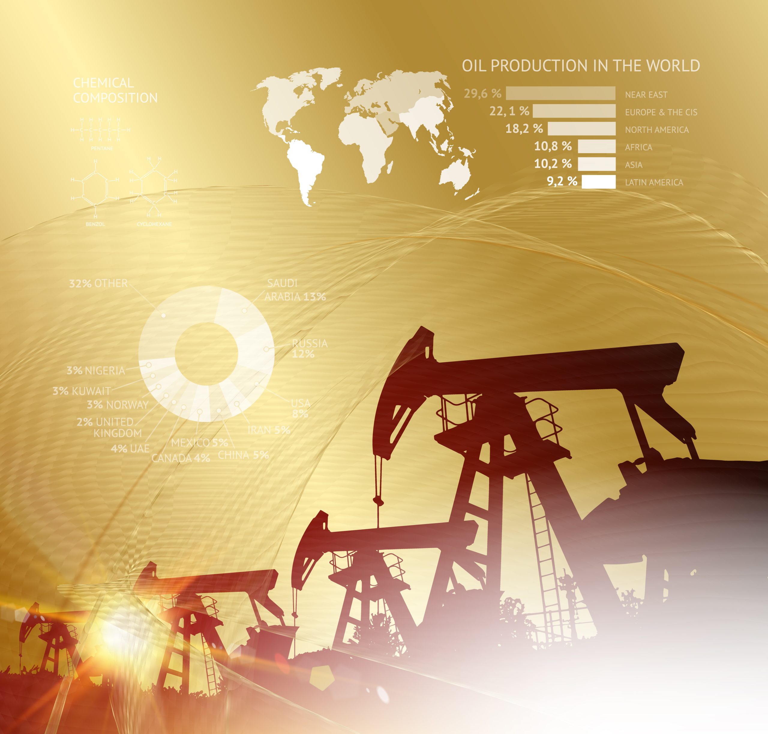 Oil derrick infographic with stages of process oil production. Industrial image with golden style. Vector illustration.